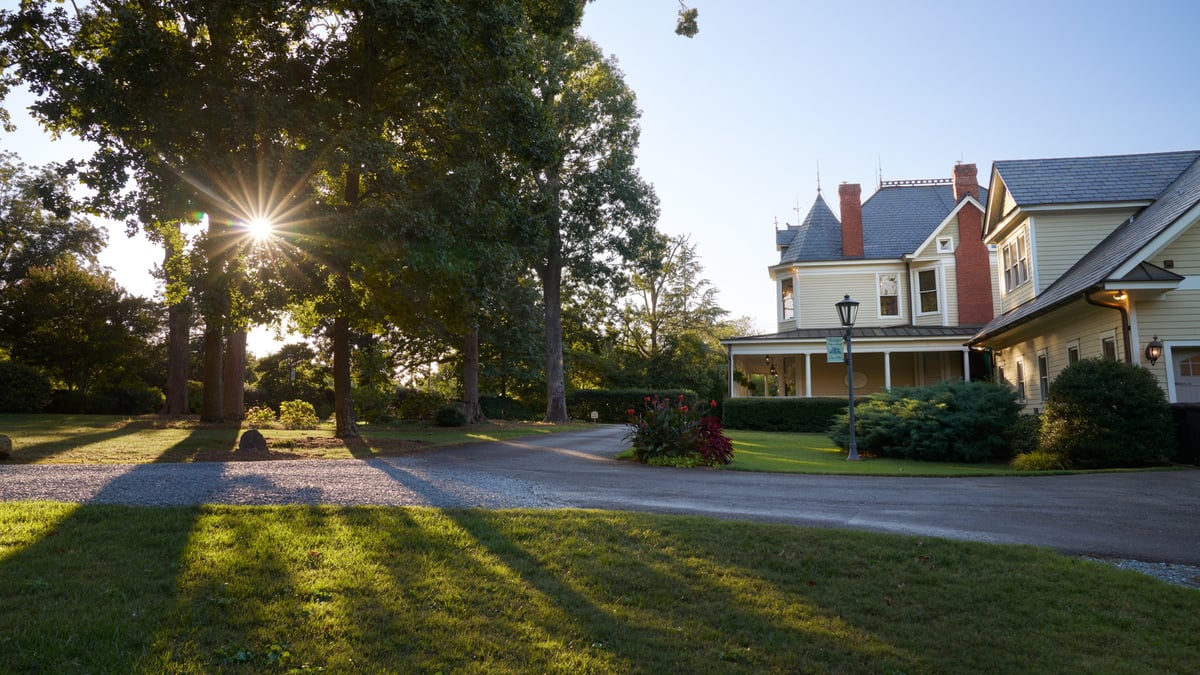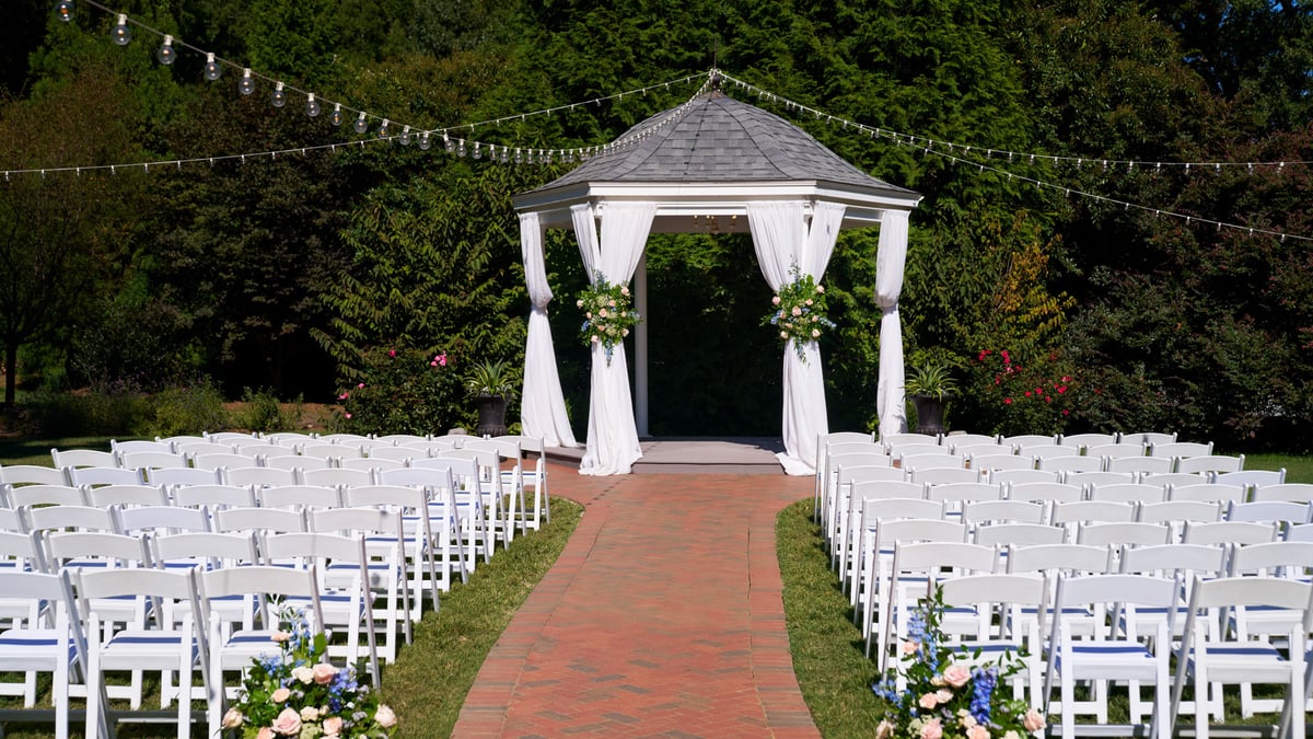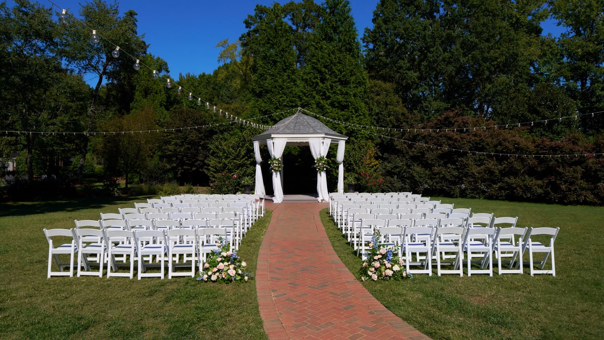 Pledge your vows in our meticulously maintained Jane's Garden, where impeccably arranged white chairs create a path to a classical white pavilion with delicate architectural details. Framed by mature oak trees that provide dappled shade and surrounded by climbing roses and seasonal blooms, this garden sanctuary offers a romantic, timeless setting with the historic Queen Anne mansion as your ceremony backdrop. The emerald lawn and flowering borders create a refined, botanical atmosphere that is an exquisite beginning to your celebration.