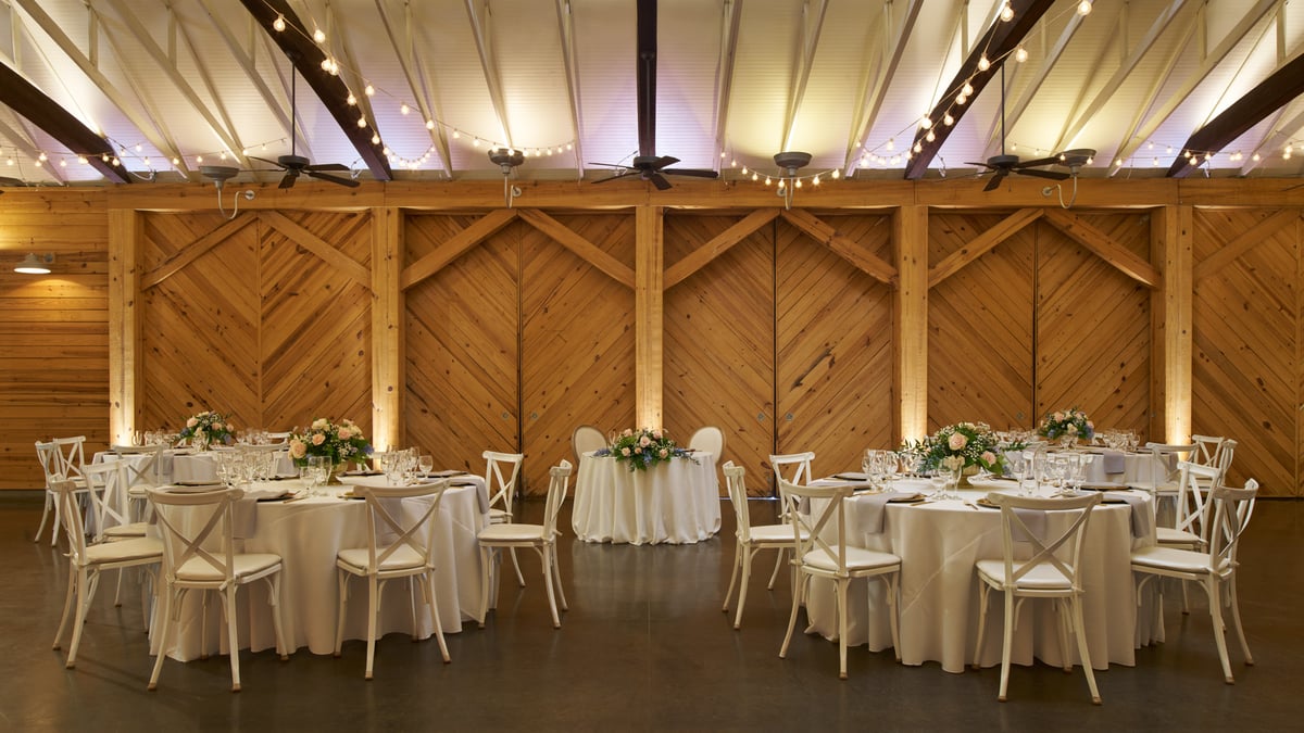 Our Grand Hall reception space showcases charming elegance with its warm wooden architecture featuring dramatic vaulted ceilings, exposed wooden beams, and distinctive herringbone-patterned walls. The spacious interior is illuminated by delicate string lights that create a romantic ambiance throughout the venue. Round tables draped in crisp white linens are complemented by comfortable white folding chairs, with table settings that can be customized to your color scheme, with emerald green napkins or elegant gold charger plates. Tall floral centerpieces featuring lush greenery and white blooms add a natural sophistication to each table arrangement. The polished concrete flooring provides a contemporary contrast to the cozy wooden elements, creating an ideal balance of modern comfort and timeless charm, an ideal setting for both dining and dancing throughout your celebration.