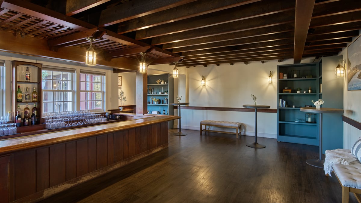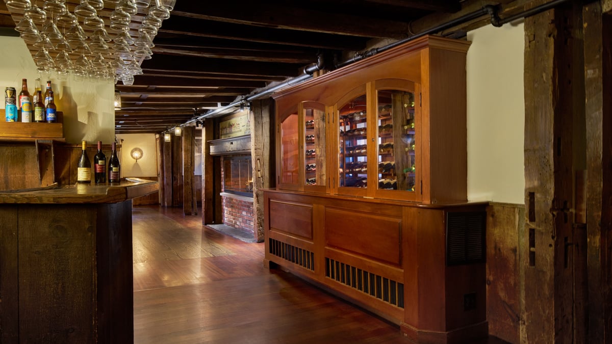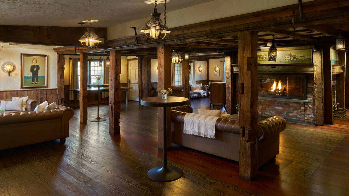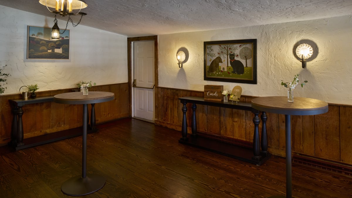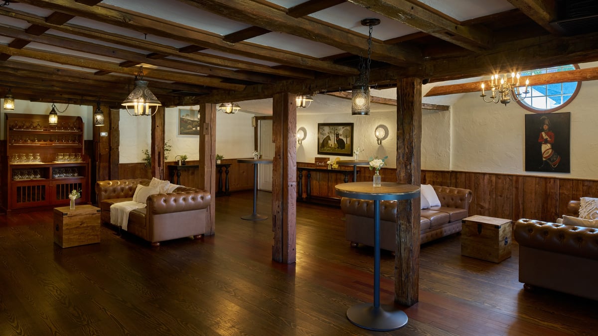 A stunning event space for couples looking for an intimate and charming setting. This historic room is located in a fully restored 17th-century building featuring low ceilings, exposed beams, and luxurious furnishings. The space can accommodate up to 60 guests for a seated event and more than 100 for cocktails. The New England Room is steeped in history, as seen in the carefully restored and maintained original walls and fireplace. You'll love the rustic and cozy character. This hall features warm lighting, rich wood accents, and elegant décor, creating a timeless and romantic ambiance to leave a lasting impression on you and your guests.