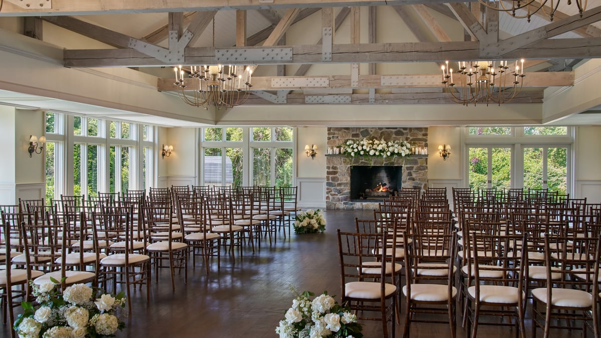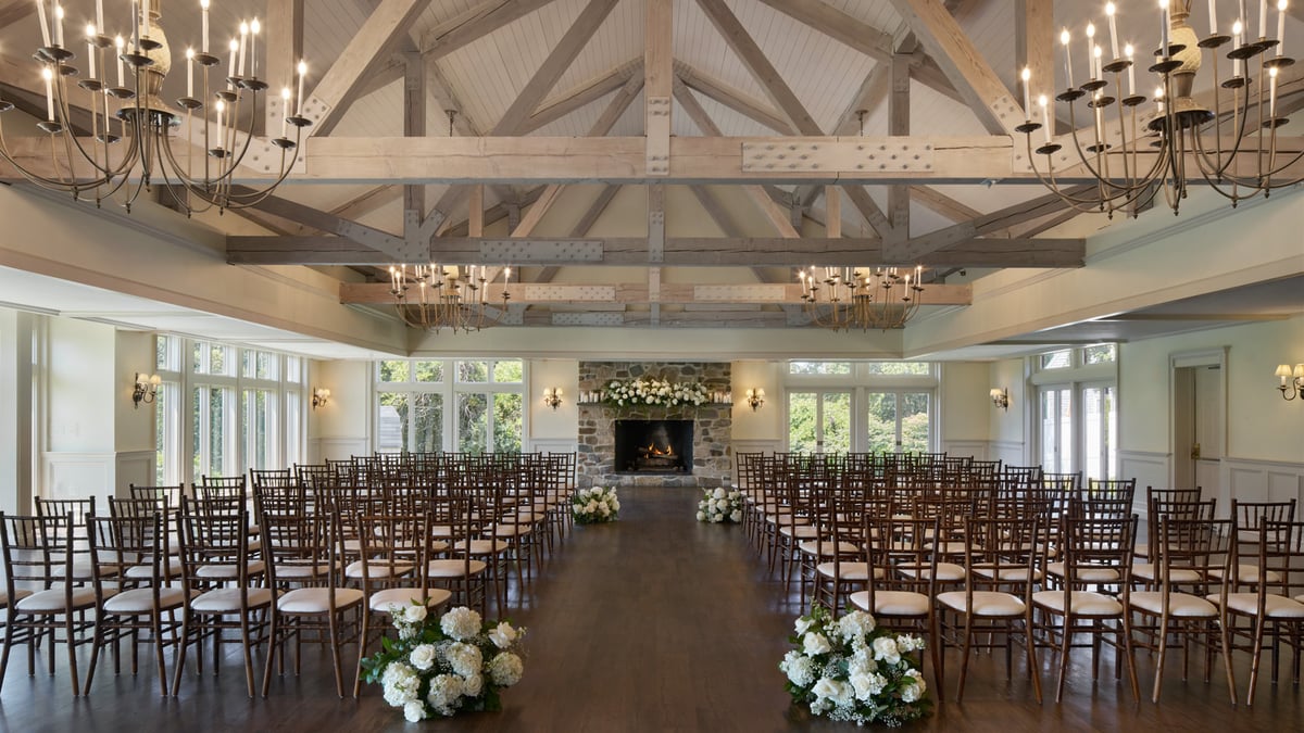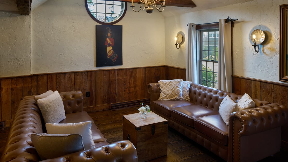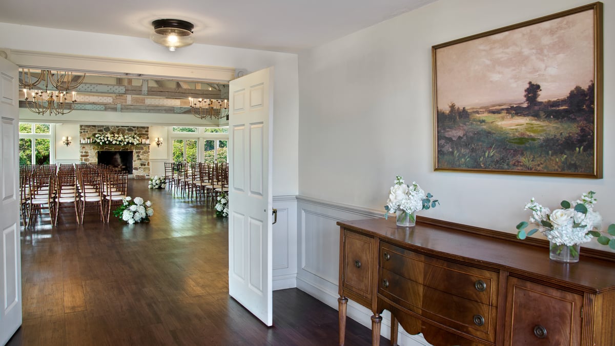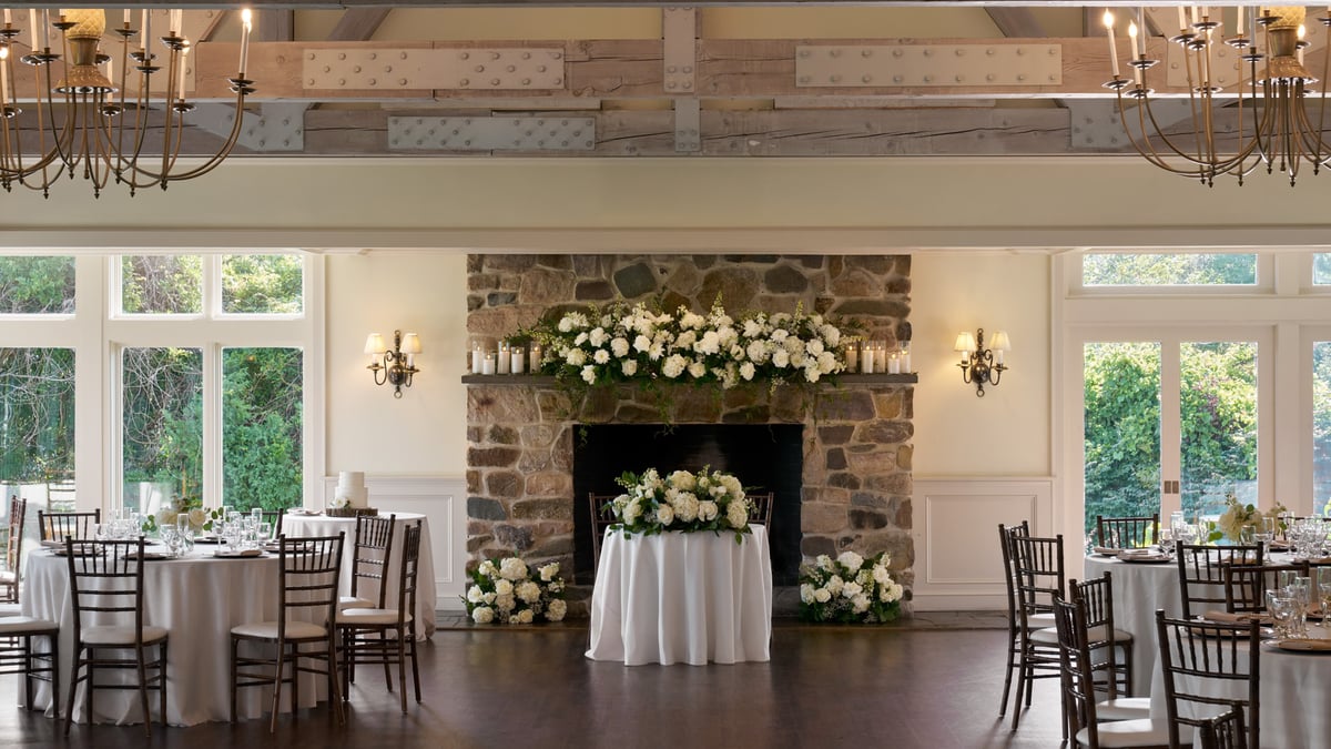 A stunning event space for couples looking for an intimate and charming setting. This historic room is located in a fully restored 17th-century building featuring low ceilings, exposed beams, and luxurious furnishings. The space can accommodate up to 60 guests for a seated event and more than 100 for cocktails. The New England Room is steeped in history, as seen in the carefully restored and maintained original walls and fireplace. You'll love the rustic and cozy character. This hall features warm lighting, rich wood accents, and elegant décor, creating a timeless and romantic ambiance to leave a lasting impression on you and your guests.