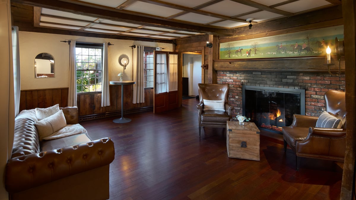 New England Room: a fully restored 17th-century building with charming low ceilings, exposed beams, and luxurious furnishings.