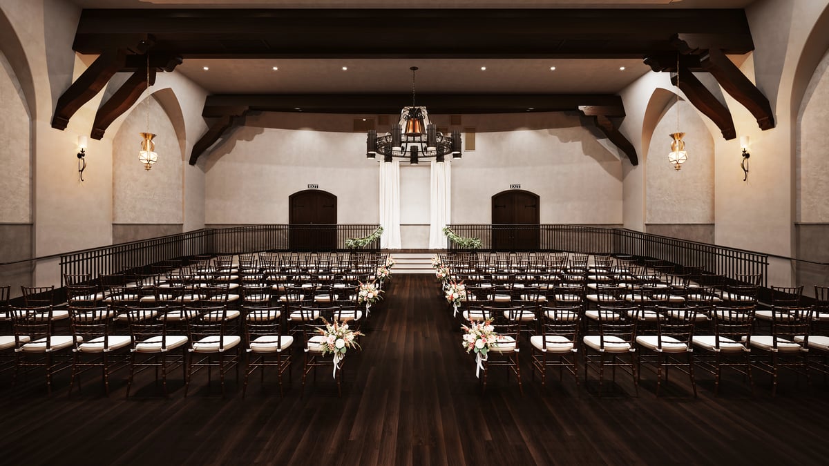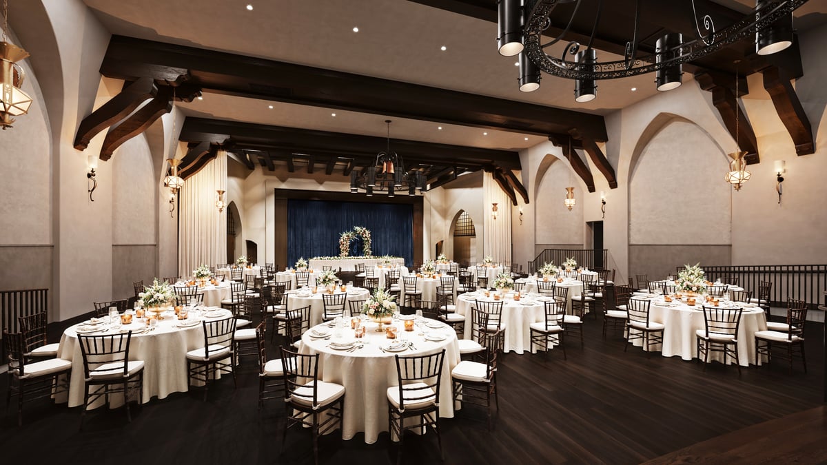 The theater seamlessly transitions from ceremony to reception space, accommodating your vision whether you envision romantic candlelit tables or a vibrant celebration. The magnificent antique chandeliers that once illuminated moviegoers now cast their warm glow over dinner and dancing. The theatrical stage serves as a stunning focal point for toasts, first dances, and entertainment. Spanish Colonial Revival architecture, including exposed wooden beams in rich dark tones and arched niches, creates an atmosphere of sophisticated elegance. The hardwood floors ground the space with warmth while providing an ideal surface for dancing the night away.