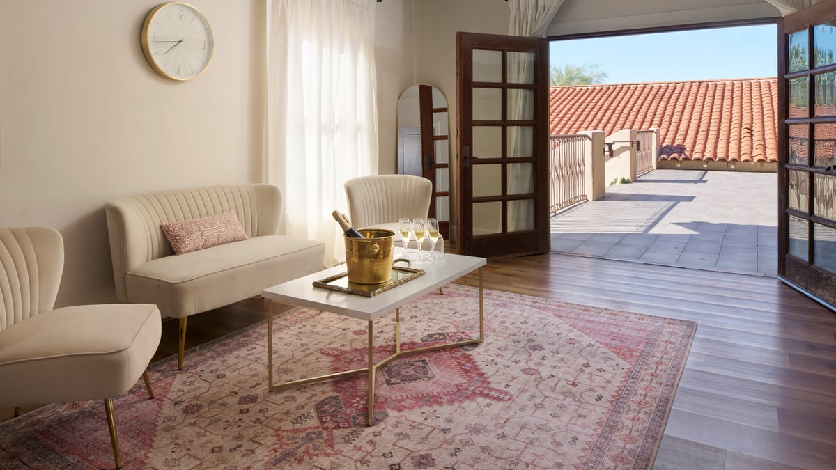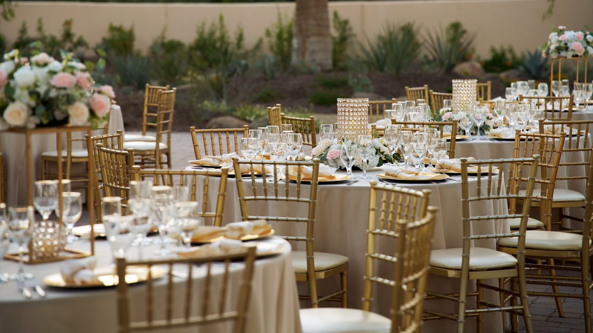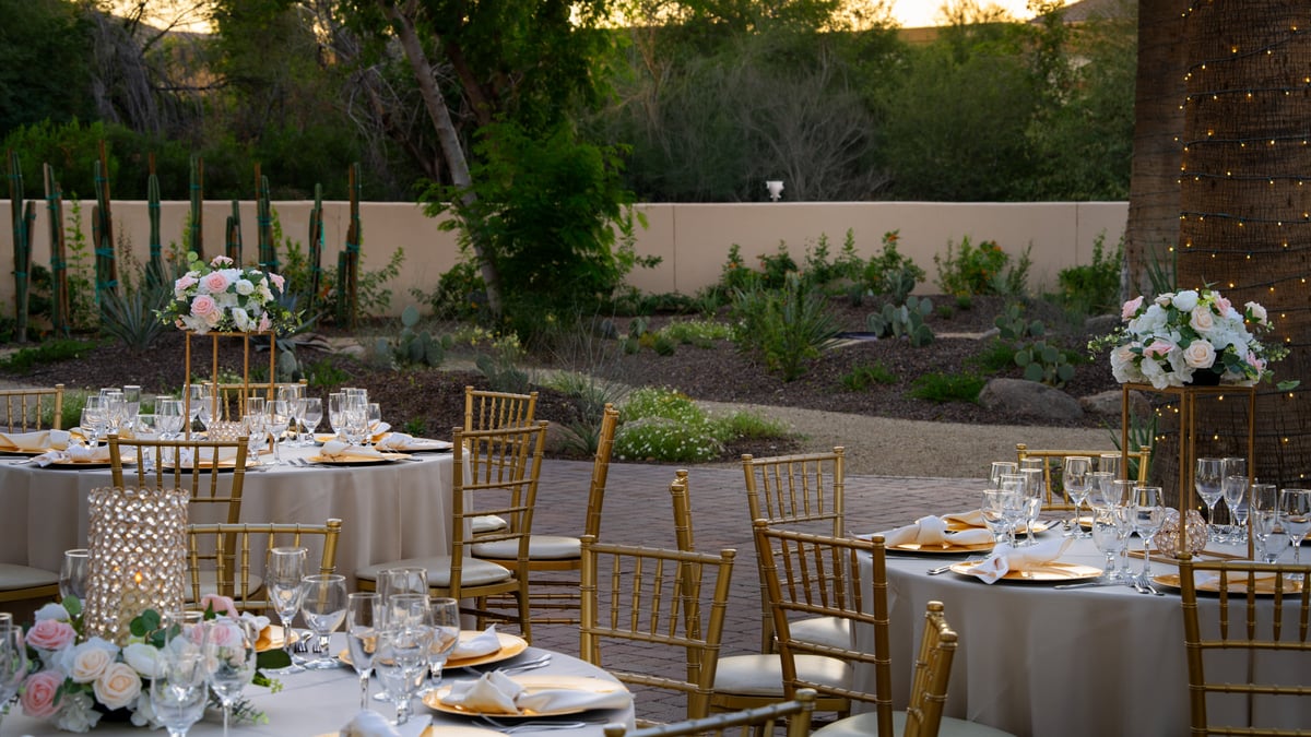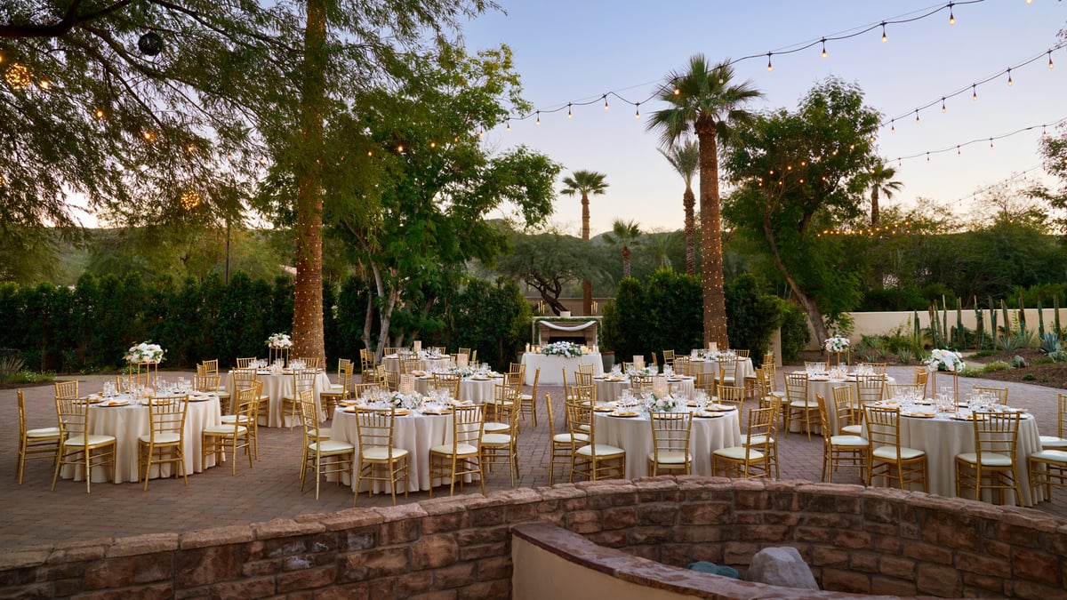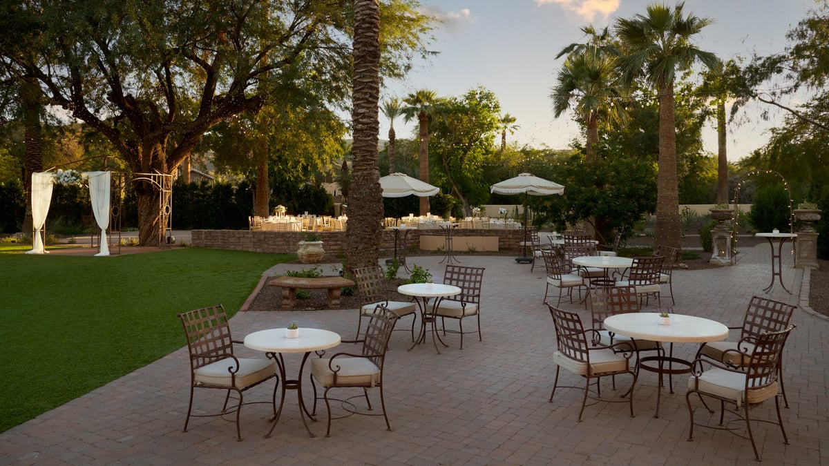 The focal point of these gardens is the giant mesquite tree that draws attention to the ceremony area. Towering date palms provide ample shade for the ceremony lawn with an Old-World iron cupola and carved stone altar. Your guests will be wowed by the embellished stone staircase where you'll make your grand entrance.