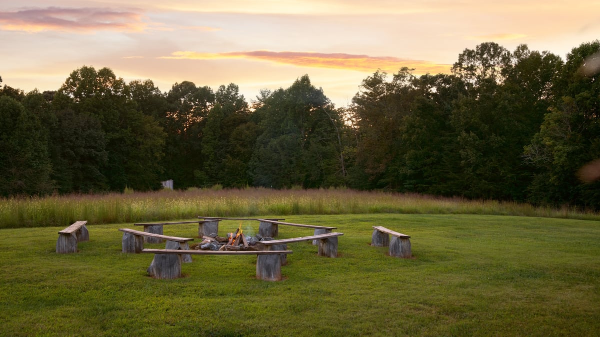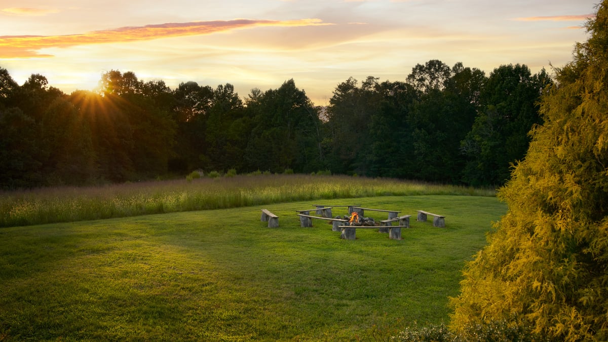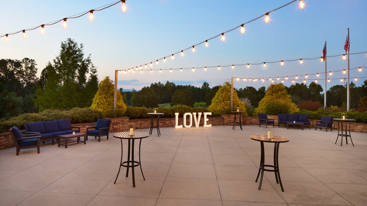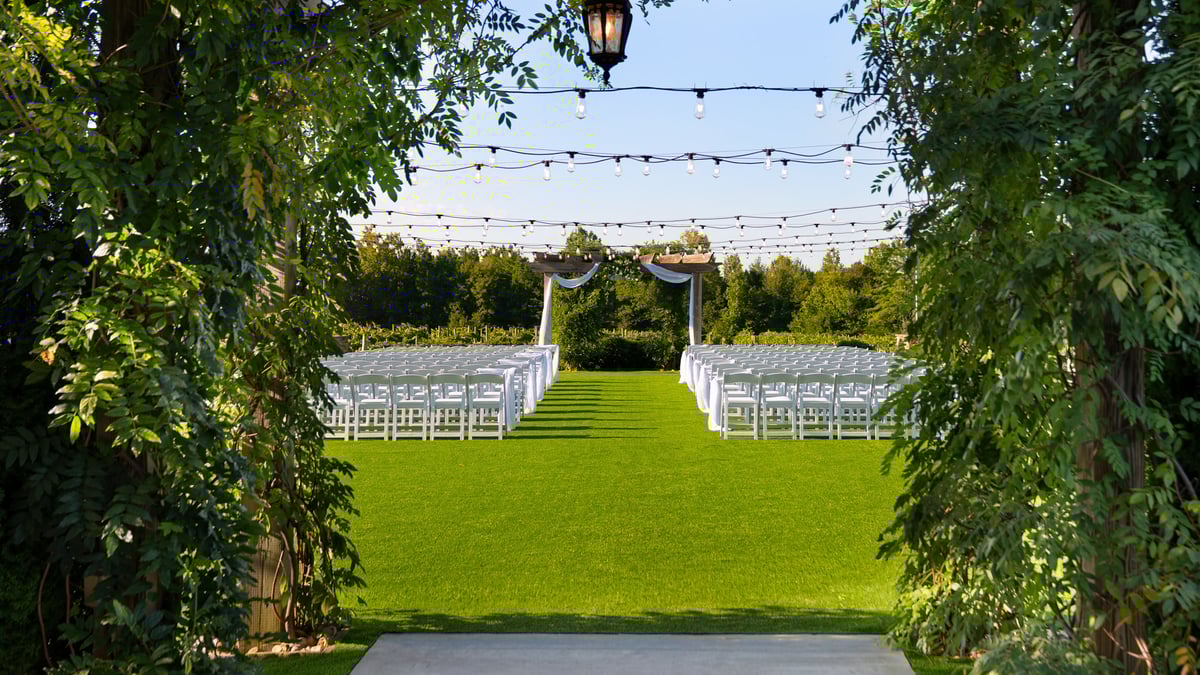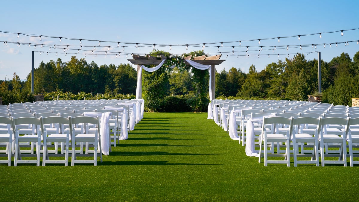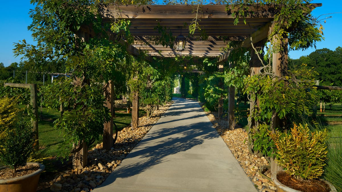 Exchange vows in our vineyard-inspired ceremony space, where a handcrafted wooden pergola creates an enchanting North Carolina backdrop. String lighting, fresh florals, and vineyard views blend to create an intimate wedding setting with endless photo opportunities. The garden features manicured landscaping, white garden chairs, and the option for customized décor to match your vision. The space transforms into a beautiful evening setting as the sun sets, casting a warm glow over the property.