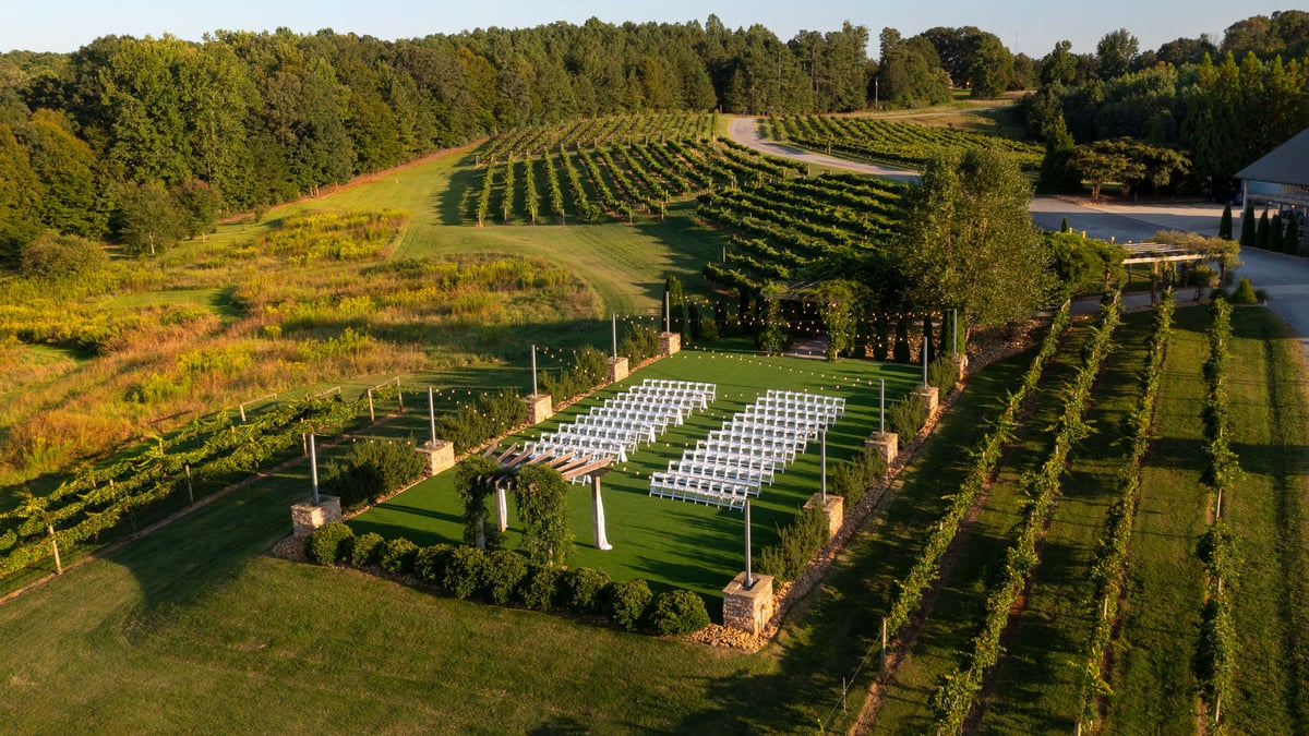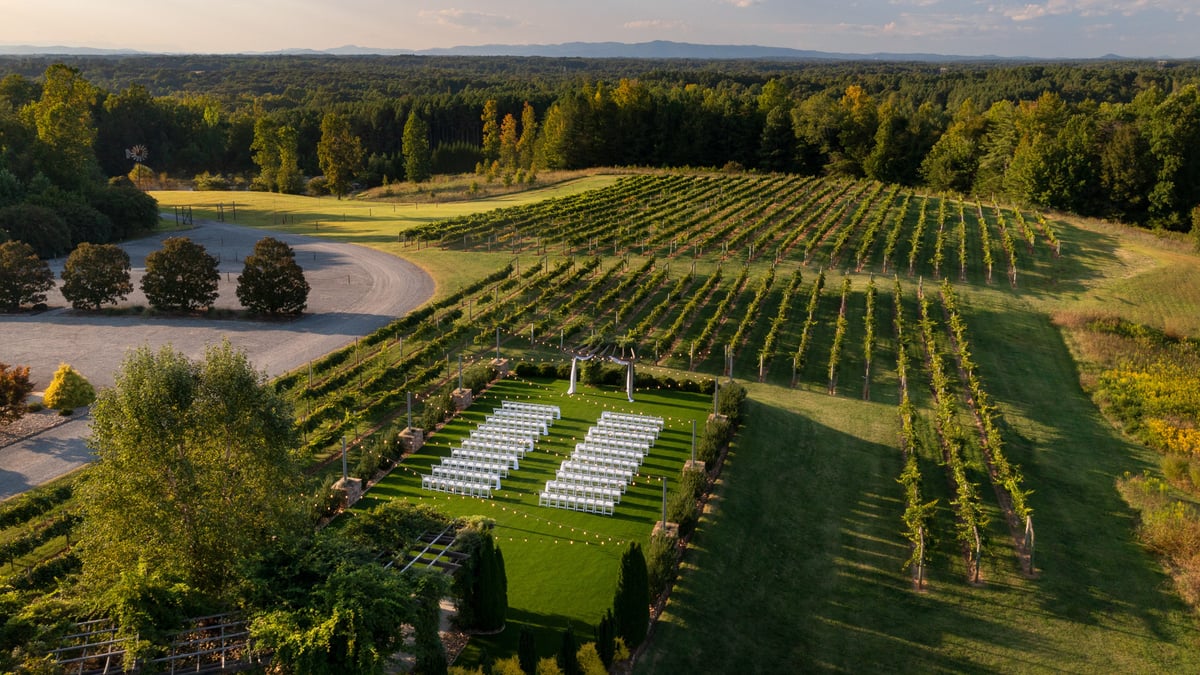 Set in the rolling hills of Shelby, North Carolina, Spinning Leaf by Wedgewood Weddings pairs country charm with sophisticated elegance. This working vineyard venue showcases a signature wooden pergola draped with flowing fabrics and twinkling lights, creating an ethereal backdrop for "I do." The venue's natural beauty shines through its manicured landscaping, stone terrace, and sweeping vineyard views, offering an authentic wine-country experience that elevates any wedding style.