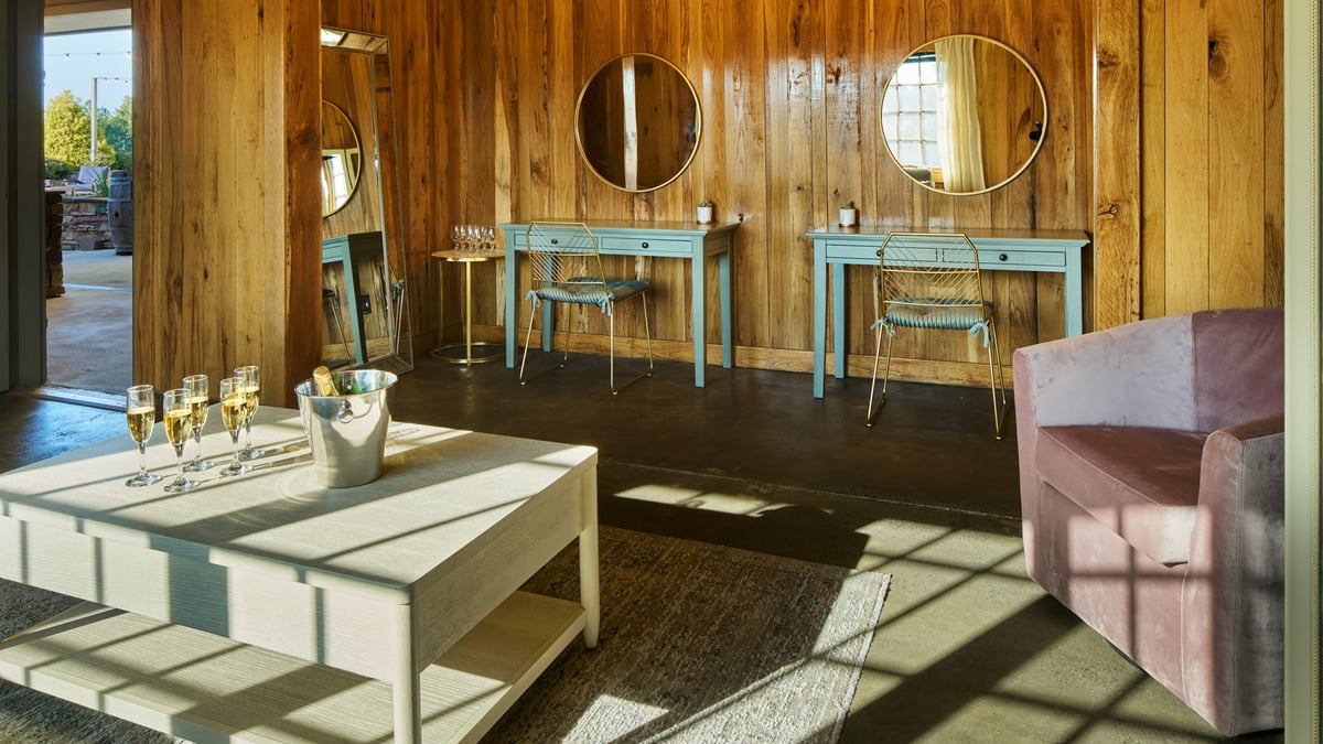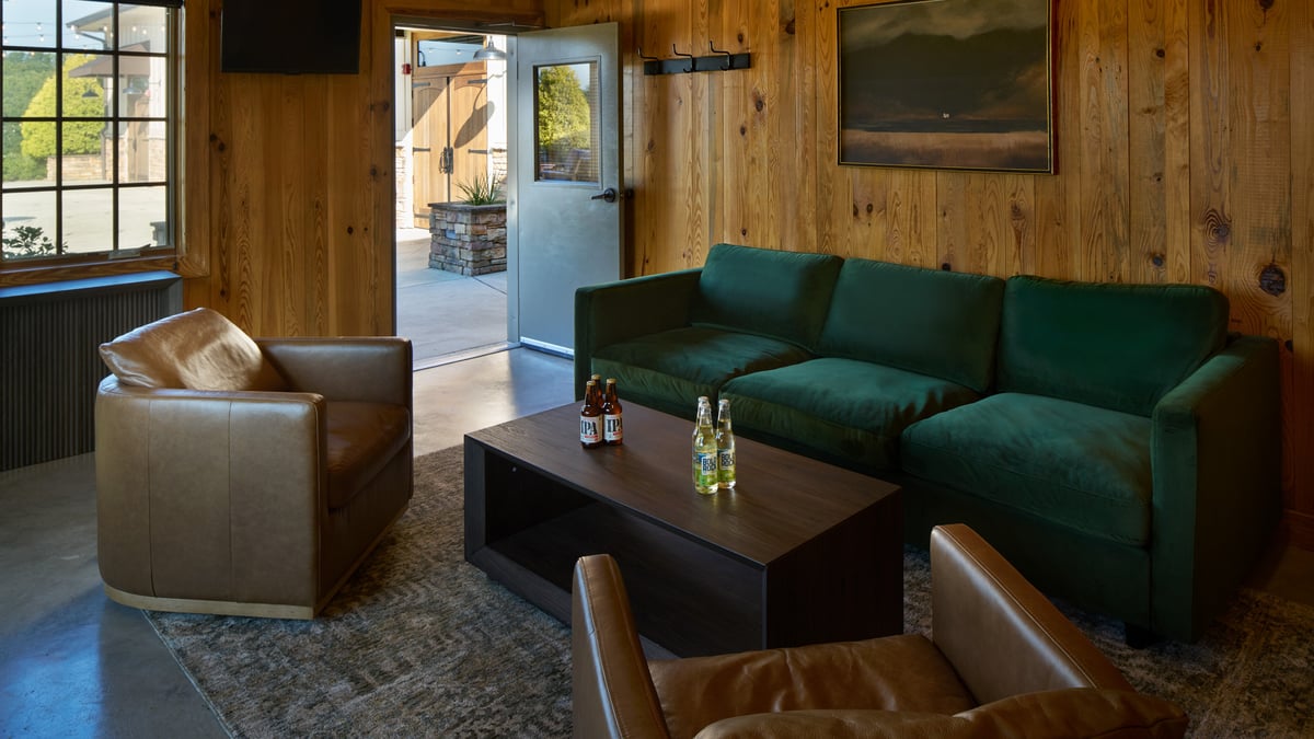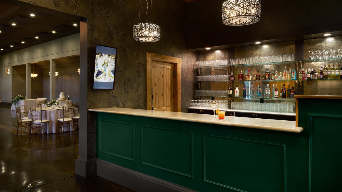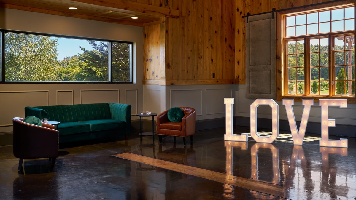 The space's natural flow allows your guests to easily move between the cozy indoor lounge and fresh-air terrace, creating multiple spaces for conversation and celebration. Inside, guests can enjoy the rustic charm while mingling, and just steps away, the terrace offers comfortable outdoor seating with wrought iron tables and chairs shaded by market umbrellas during daytime events.