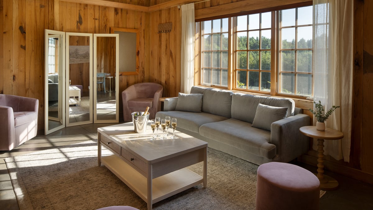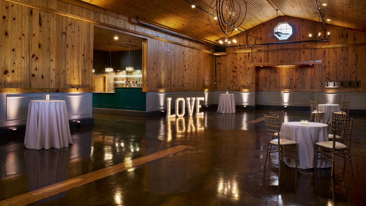 Harvest Lounge at Spinning Leaf offers a seamless blend of indoor-outdoor celebration spaces for your cocktail hour and reception enjoyment. Inside, the warm embrace of timber walls and soaring pine ceilings creates an intimate atmosphere, while circular chandeliers cast a welcoming glow across the polished concrete floors. This rustic-elegant interior opens directly onto a spacious stone terrace, where market lighting strings crisscross overhead and custom stone walls frame the scenic surroundings.