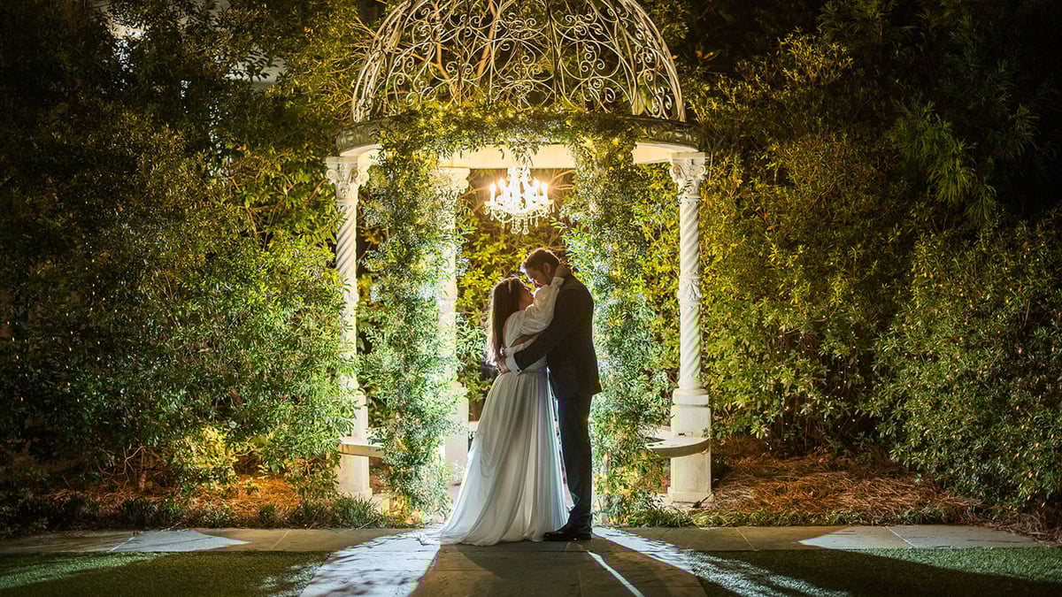 Your ceremony unfolds in a true garden sanctuary bordered by seasonal blooms, ensuring year-round color. At the heart stands a stunning Italian stone gazebo crowned with an intricate iron filigree dome—an architectural focal point requiring minimal decoration while providing maximum impact. A greenery-laden arbor creates a natural frame for vows, while a cozy garden bench offers intimate photo opportunities.