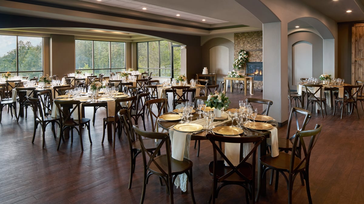 The Lower Level reception space displays a mountain-rustic aesthetic, including wood art installations, farm-style doors, and dark wood flooring. Guests will appreciate the panoramic forest views, natural lighting, and the stone fireplace. Cocktails and conversations will take place outside on the lower terrace, with a gorgeous bar surrounded by flourishing flora and fauna.