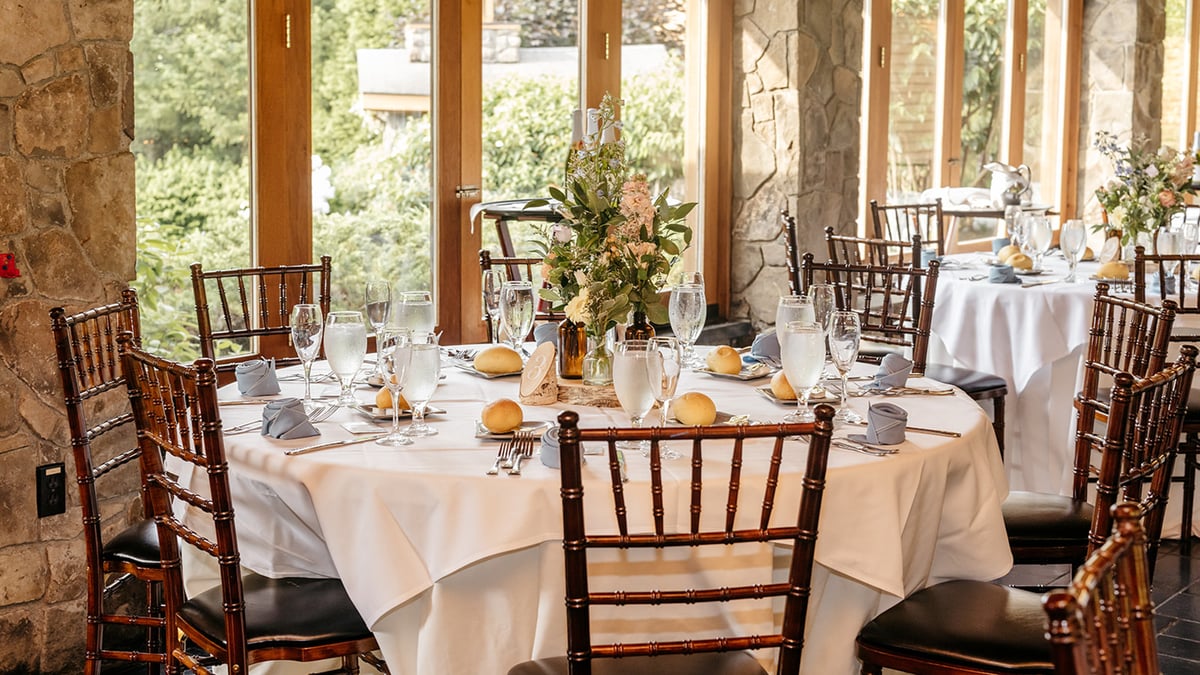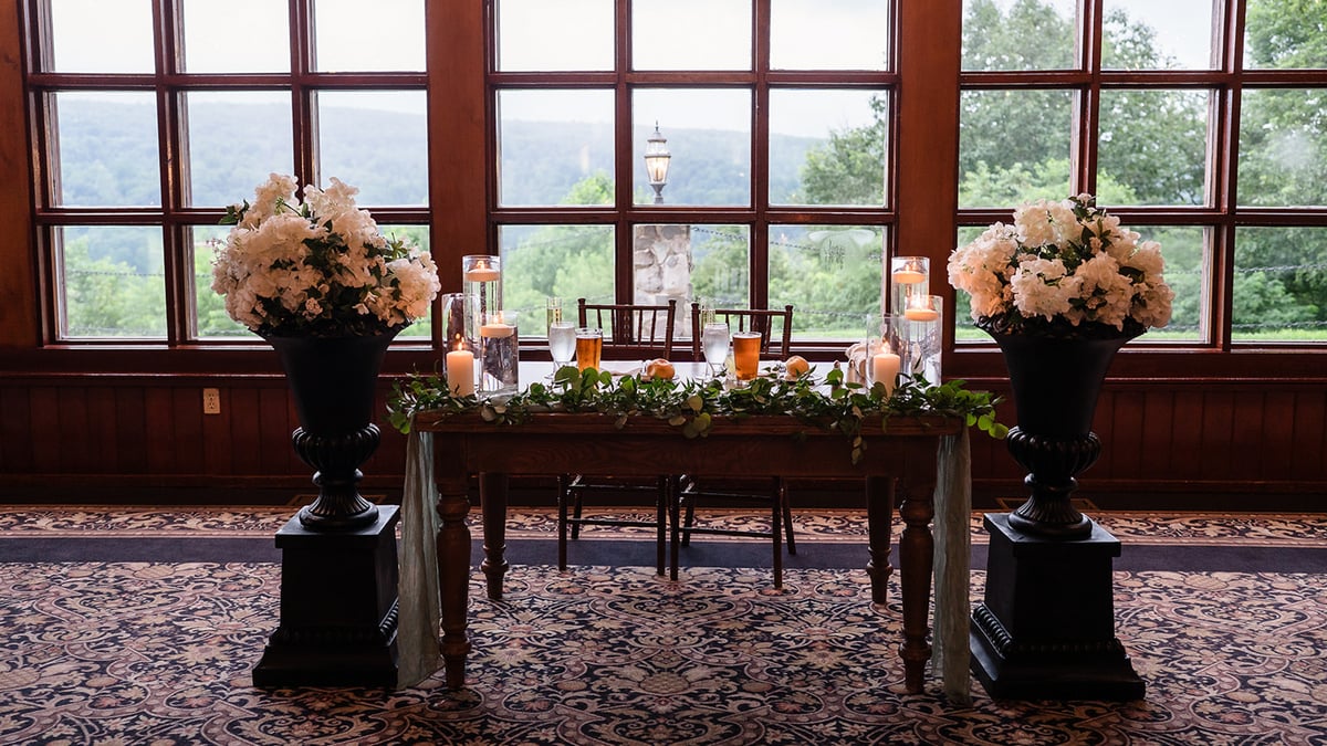 Terraview stands as Stroudsmoor's crown jewel — a premier facility with a striking stone-castle façade. Inside, prepare to be amazed by soaring 22-foot peaked ceilings, dramatic 16-foot windows showcasing spectacular mountain views, and a remarkable 32-foot bandshell with a dedicated dance floor. The elegant Conservatory and lounge provide the perfect setting for cocktail hour, where guests enjoy panoramic views of the Terraview gardens before moving into the grand reception space.